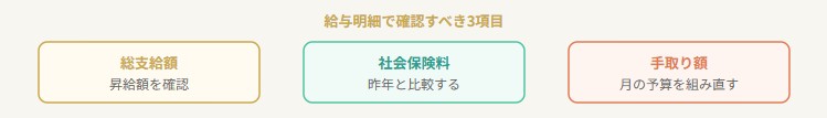 01給与明細をチェックする4月の給与明細は必ず確認してください。昇給があった場合はもちろん、社会保険料が変わっていないかも重要なポイントです。社会保険料は毎年4〜6月の給与をもとに見直されます(定時決定)。残業が多かった月があると、秋以降の手取りが減ることがあります。
